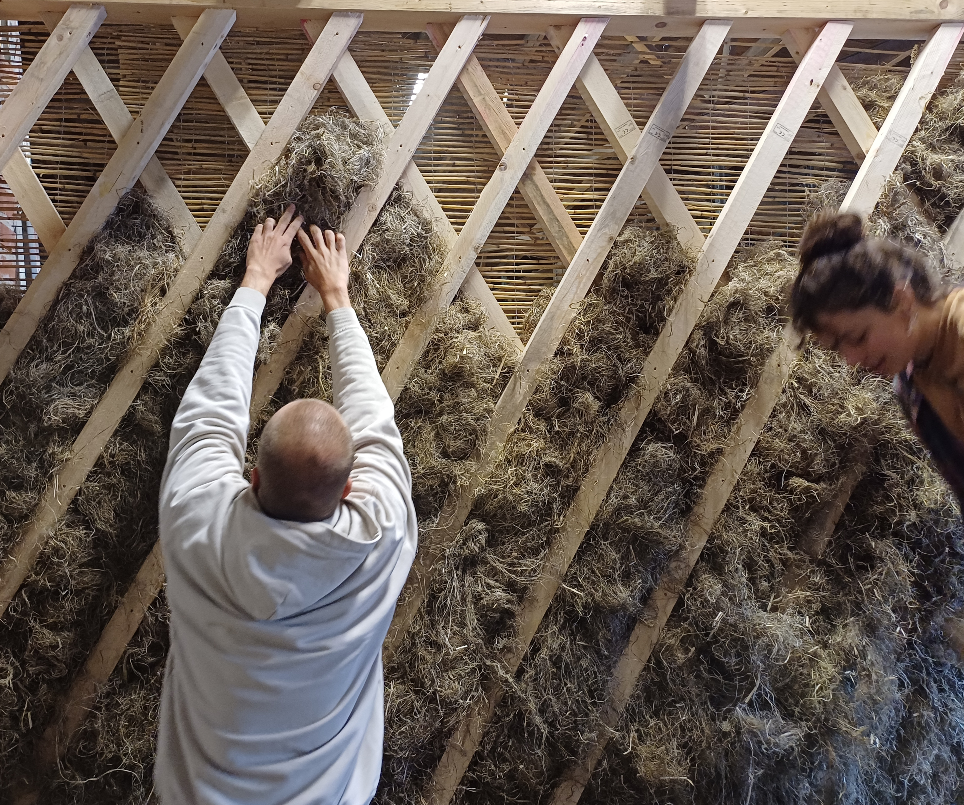 Die mit Stopdhanf ST50 gedämmten Flächen werden wieder mit der Reetmatte so verschlossen, dass die Laufdrähte wieder außen, an jedem Knoten Laufdraht / Ständerlatte getackert wird.