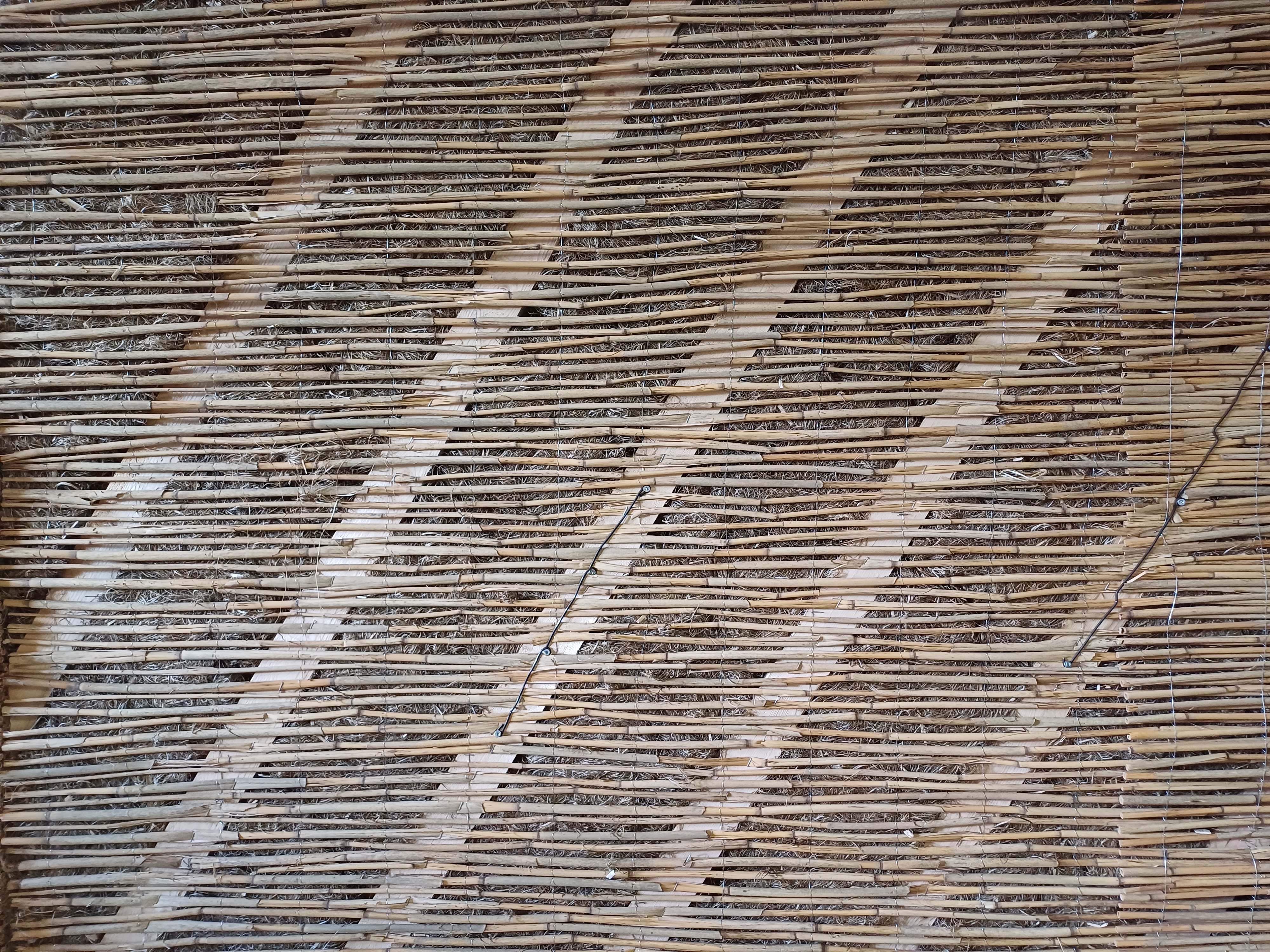 Einseitig wird vollflächig die Reetmatte immer an jedem Knoten Laufdraht / Ständerlatte angetackert.