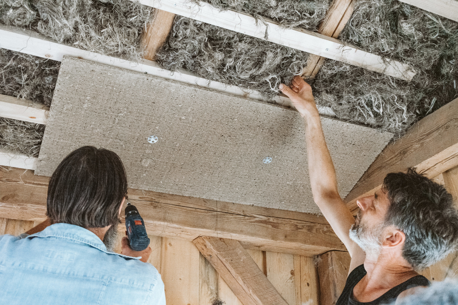 Zuerst wird die Sparschalung für die später anzubringenden Platten montiert und dann den Stopfhanf zwischen die Sparren und zwischen die Sparschalung gebracht.