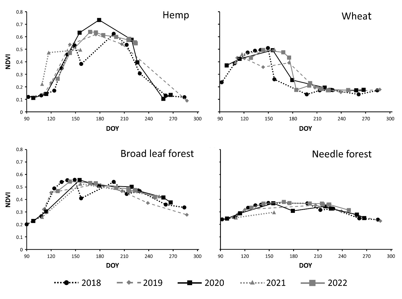 Abb. 2: ETa-Datenpunkte für Hanf, Weizen, Laubwälder und Nadelwälder über die Vegetationsperioden 2018-2022. DOY bezieht sich auf das n-te Jahr jedes Jahres.