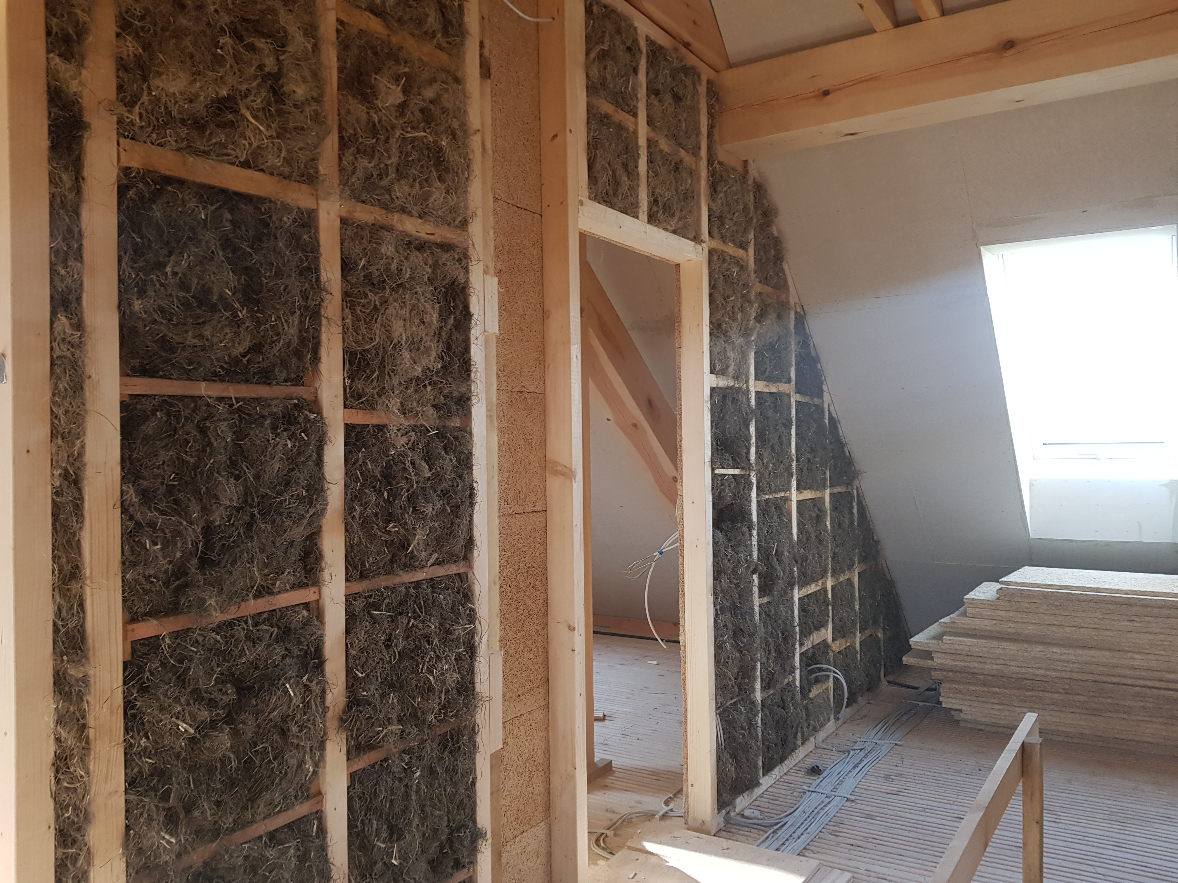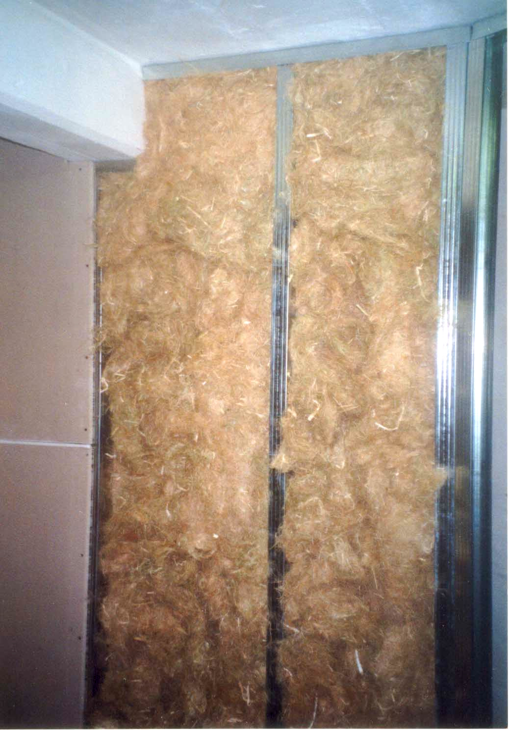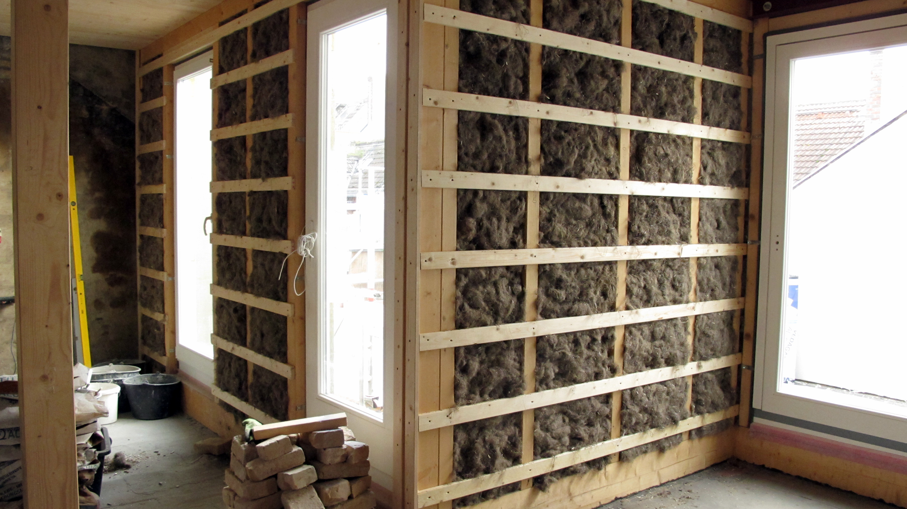 Eine schnelle und sehr preiswerte Variante einer schalldämmenden Zwischenwand ist der Schilf-Hanf-Trockenbau mit Schrägständern.
